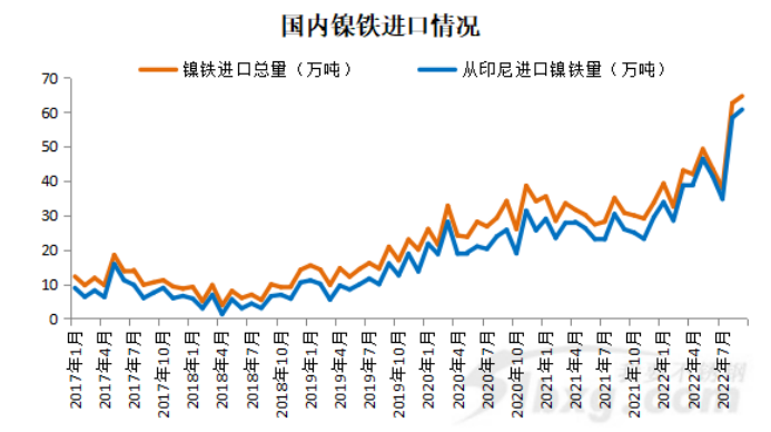 2022年1月~9月,國內鎳鐵進口總量為414.22萬噸,同比增47.94。其中,自印尼進口鎳鐵為318.28萬噸,同比增61.14%。